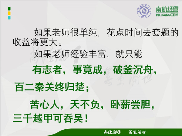 课堂上,邓老师为了加深同学们对某个概念的理解而笑评一些现象,但是玩笑开罢,邓老师一定会在最后向同学们传递正能量。谈及“资源配置效率问题”时,邓老师笑道学生在考试前花时间套老师的题目可能会获得更大收益,但话锋一转,又引经据典,提醒同学们对待学业时一定要怀揣“有志者、事竟成,破釜沉舟,百二秦关终属楚;苦心人、天不负,卧薪尝胆,三千越甲可吞吴”的抱负。