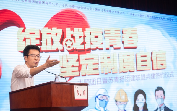 在共青团江苏省委的指导下,我校团委与新华报业传媒集团、省国信集团、江苏交通控股、国网江苏电力、省人民医院、中国银行江苏省分行等七家单位团委共建“苏青扬”团建联盟。7月3日,“绽放战疫青春 坚定制度自信”主题团日暨“苏青扬”团建联盟共建签约仪式隆重举行,共青团江苏省委副书记潘文卿,校党委副书记陶勇,以及各相关单位领导出席仪式。