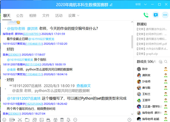 这个暑假,为备战2020年全国大学生和研究生数学建模竞赛,根据年度教学计划,理学院精心组织了为期七周的暑期数学建模培训,约600名学生、30余位指导老师参与,是历年参训学生最多、参与老师最多、培训课时最长的一次培训。结合今年疫情防控要求,本次培训全程在线,理学院指导老师利用腾讯课堂,采取多种形式提升参训学生团队合作能力。截至目前,本次培训已布置6次大论文和16次编程小作业,各学生小组在线听课,通过练习小作业和撰写论文的形式来巩固建模基本知识和技能,提高解决实际问题的能力,为参加国赛打下良好基础。