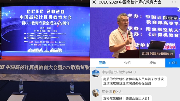 8月21日至24日,2020中国高校计算机教育大会在南京召开,会议由中国计算机学会(CCF教育专业委员会)、全国高等学校计算机教育研究会、教育部高等学校计算机类专业教学指导委员会主办,南京航空航天大学和江苏省软件新技术与产业化协同创新中心承办,《计算机教育》杂志社及《软件导刊》杂志社协办。本次大会采用线上线下结合的形式,中国工程院院士、清华大学郑纬民教授,中国科学院王怀民院士,国家“万人计划”教学名师、我校副校长施大宁教授,国家教学名师、北京工业大学蒋宗礼教授,杰出青年基金获得者、中科院计算所所长助理陈云霁研究员,国防科技大学王志英教授,武汉大学何炎祥教授等应邀出席会议,来自全国高校、科研院所、企业的400余位计算机教育相关的专家学者及从业人员现场参加会议,4000余人线上同步观看大会直播。