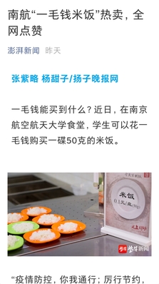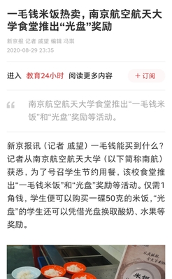 新京报:一毛钱米饭热卖,南京航空航天大学食堂推出“光盘”奖励