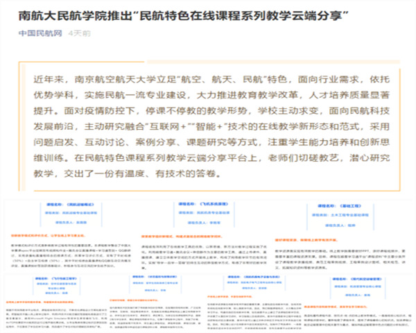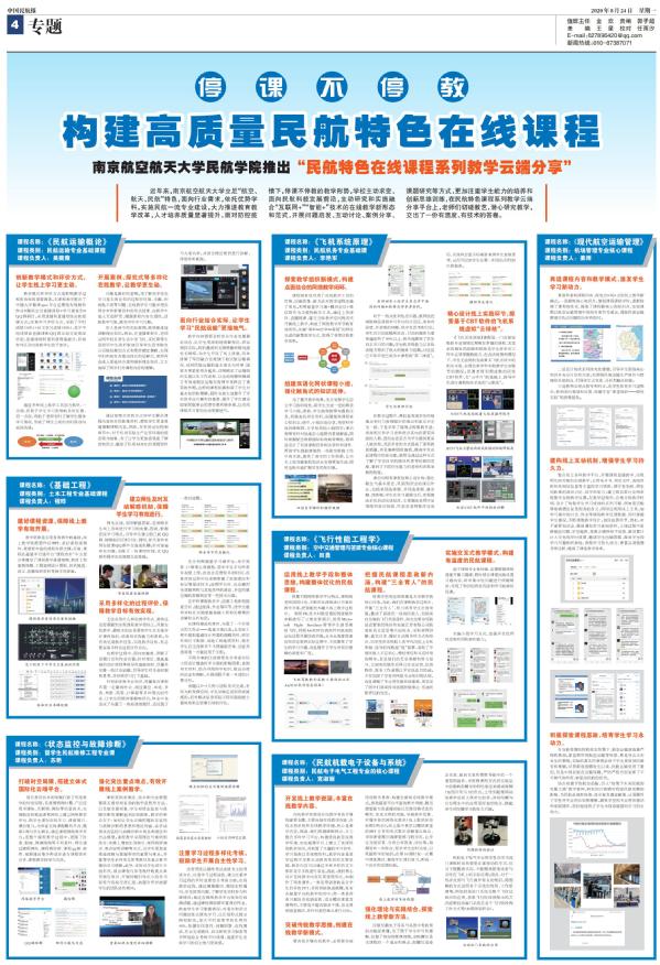在疫情停课不停教的教学新形势下,民航学院主动求变,面向民航科技发展前沿,主动研究和实施融合 “互联网+”“智能+”技术的在线教学新形态和范式,鼓励老师们通过潜心研究教学,以问题启发、互动讨论、案例分享、课题研究等方式,开展了在线课程系列教学云端分享。活动得到中国民航报高度关注,于8月24整版刊登系列课程,于9月1日在中国民航报公众号全文刊登。