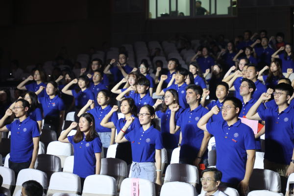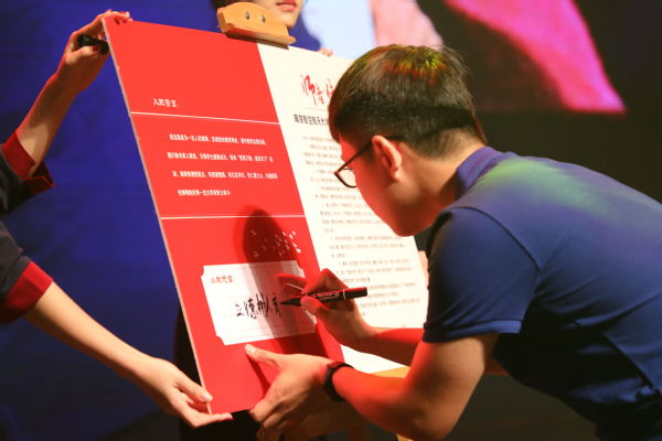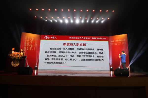 来自理学院的倪勤教授为新入职教师代表能源与动力学院王飞龙佩戴校徽,并作为退休教师代表发言。王飞龙带领全体新入职教师签署《师德承诺书》,并在王飞龙领誓下,全体新教师进行了庄严的入职宣誓,铿锵的誓言表达着他们献身教育事业、续写南航明天辉煌的决心。