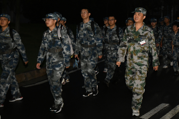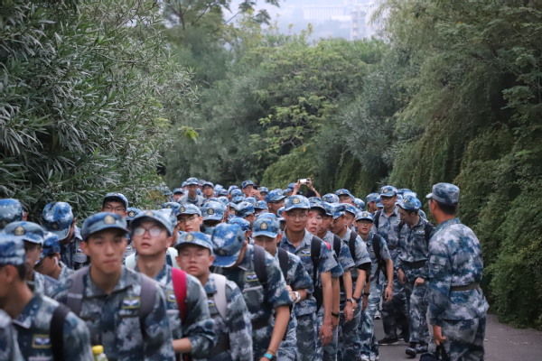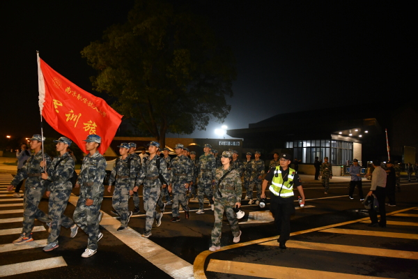 22日三点四十分,天目湖校区民航学院(飞行学院)900余名军训新生按连纵队依次在西操场列队排开。四点整,人员集结完毕,随着军训旅政委侍旭一声令下,天目湖校区野外行军拉练正式开始。拉练队伍西出南航校门,沿燕山南路前进,目标直指天目湖畔。行进过程中,教官及十九名新生组成的尖刀班开路,军训旅首长们紧随其后,带领着大部队向前进发。同学们步伐整齐、斗志昂扬。队伍后方,救护车及收容车跟随,时刻保障拉练安全。经学校各部门前期协调,溧阳市公安、交警等部门提前对沿途道路实施交通管制,在各大路口均安排了充足警力,为此次拉练保驾护航。6点,拉练队伍顺利抵达天目湖畔,各连队整队并稍作休整后依次沿大坝参观并合影留念。