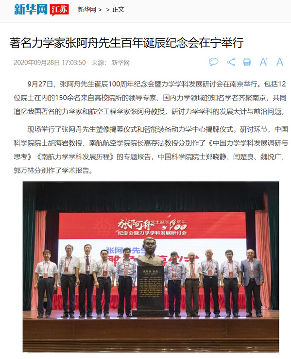 今年,是我校张阿舟先生诞辰100周年,9月27日,12位院士、百余名专家学者齐聚金陵,共同纪念“航空先驱”张阿舟的百年诞辰。纪念活动也得到了光明日报、新华网、中国新闻网等媒体的报道。