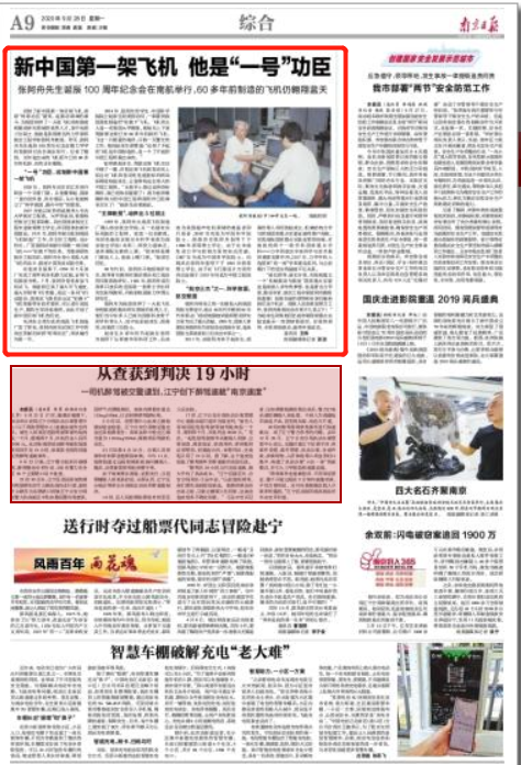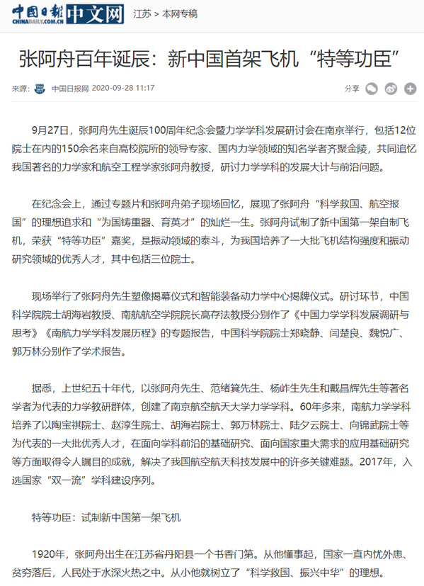 南京日报:新中国第一架飞机他是“一号”功臣 张阿舟先生诞辰100周年纪念会在南航举行,60多年前制造的飞机仍翱翔蓝天