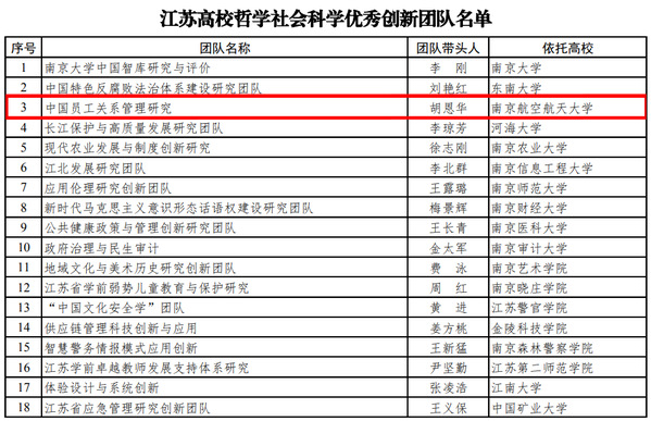 近日,江苏省教育厅公布了江苏高校哲学社会科学优秀创新团队遴选名单。经学校推荐、专家评选、省教育厅审定, 由我校胡恩华教授领衔的“中国员工关系管理研究团队”获批江苏高校哲学社会科学优秀创新团队。