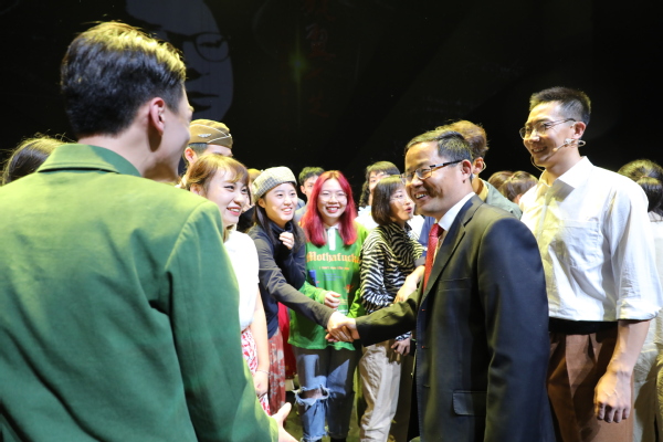 演出结束后,现场观演领导与演创团队交流并合影留念