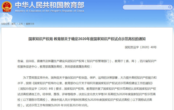 近日,国家知识产权局、教育部公布了2020年度国家知识产权试点示范高校名单(国知发运字〔2020〕40号),经前期推荐、答辩评审等程序,其中30 所高校获批2020年度国家知识产权示范高校,80所高校获批2020年度国家知识产权试点高校。我校成功获批2020年度国家知识产权示范高校。