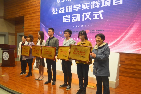 我校及南京大学、东南大学、南京中医药大学和南京艺术学院成为首批项目公益实践基地,5所学校的校团委代表上台接受了实践基地铜牌。今后,各学校将共享优质学科资源,启迪中小学生树立远大理想,同时积极开展“结伴前行活动”,通过书信、支教等多层次互动,为大学生与中小学生搭建交流平台。