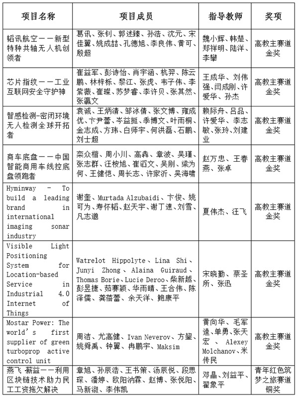 航空学院魏小辉等老师指导的“韬讯航空—新型共轴无人机创领者”、自动化学院赖际舟等老师指导的“智感检测—密闭环境无人检测全球开拓者”、电子信息工程学院王成华等老师指导的“芯片指纹—工业互联网安全守护神”、能源与动力学院赵万忠等老师指导的“商车底盘—中国智能商用车线控底盘领跑者”4支团队斩获高教主赛道大陆项目金奖;电子信息工程学院夏伟杰等老师指导的“Hyminway—To build a leading brand in internationalimaging sonar industry”、电子信息工程学院宋晓勤等老师指导的“Visible light positioning system for location-basedService inindustrial 4.0 internet of Things”、能源与动力学院黄向华等老师指导的“Mostar Power”3支团队斩获高教主赛道国际项目金奖,航空学院周正东等老师指导的“Cloud Service for Automatic and Precise TumorRadiation Treatment Planning”、航空学院魏小辉等老师指导的“HangYu Taking-off - The leaderof future aircraftlanding systems”2支团队斩获国际项目银奖;经济与管理学院邓晶等老师指导的“燕飞·薪益”项目斩获红旅赛道全国铜奖;赵万忠、王成华、魏小辉、赖际舟等老师荣获“创新创业优秀导师奖”;南航连续三次荣获“先进集体奖”。