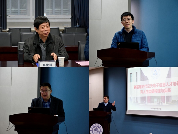 南京理工大学电子工程与光电技术学院院长柏连发介绍了南京理工大学光电学科第五轮学科评估情况,他从教育部学科评估方案谈起,以工科为例简要分析了学科评估的指标体系,对人才培养、师资队伍、科学研究、社会服务等指标进行了探讨。同时,他以光电学科上一轮学科评估数据为参照进行了学科竞争分析,阐述了存在的问题及工作思路。吴启晖做了题为“新基建时代空天电子信息人才培养育人生态链构建与实践”的报告。他简要介绍了我校电子信息工程学院的历史沿革、学院设置、师资队伍,提出我校电子信息工程学院建设的“三航”特色,由此阐述了学院面向空天信息人才培养的育人生态链建设,分享了育人生态链在创新实践教学中的优异成绩,提到创新实践育人成果服务国家社会的成效显著。他指出,要强化人才培养中心地位,在“新基建”重大战略背景下打造人才“底座”。