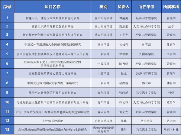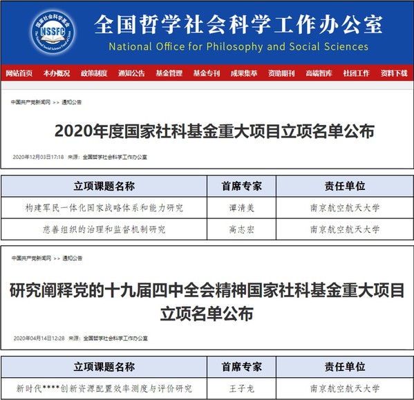近日,全国哲学社会科学工作办公室陆续公布了2020年度国家社科基金各类项目立项资助情况,我校本年度共获批国家社科基金项目13项(其中,重大招标项目3项,重点项目1项,一般项目6项,青年项目3项)。重大项目立项数为历年之最,各类项目立项总数继续位居工信部高校第一。
