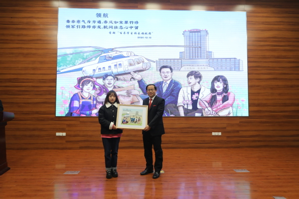 在开班仪式上,“百名学生校长领航团”班长、电子信息工程学院鲍禹桥从学生的期待、肩负的责任、努力的方向等方面介绍了领航团班级概况和运转机制,学生代表向校长赠送了手绘作品,百名学生与校长现场扫码加群。