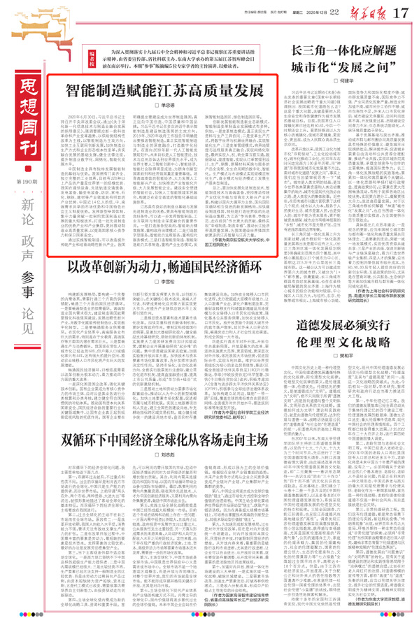 总之,要加快发展先进制造技术、智能制造技术与高端装备,坚持推动传统产业优化升级与培育壮大新兴产业并重,构建以国内大循环为主体、国内国际双循环相互促进的新发展格局,加快建设制造强国,特别是打造世界级的先进制造业集群,为江苏“争当表率、争做示范、走在前列”作出更大的贡献,最终实现“幸福制造,制造幸福”,推动长江经济带高质量发展,为我国建设世界强国贡献更多的江苏智慧与江苏力量。