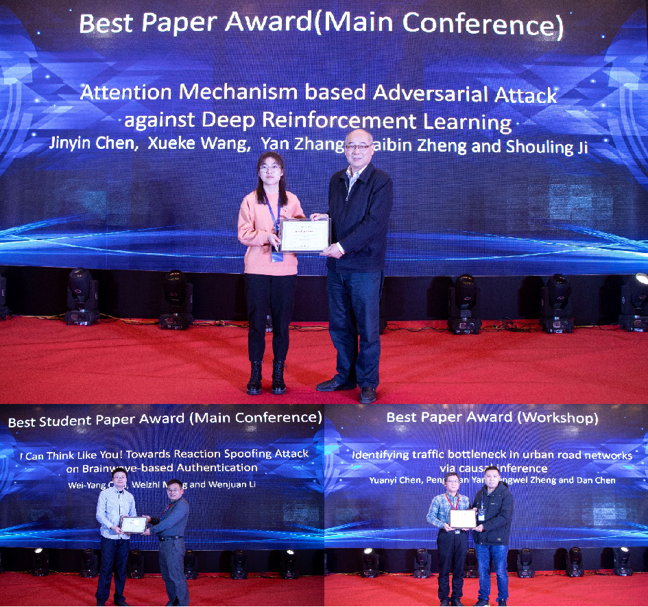 会议期间,通过特邀报告和学术报告相结合的形式,邀请了IEEE Fellow、新加坡南洋理工大学Dusit Niyato教授,IEEE Fellow、香港理工大学曹建农教授,清华大学丁津泰教授,清华大学翟季冬教授以及深圳大学伍楷舜教授等共6位专家做了特邀报告。此外,共73位国内外学者就密码学、系统安全、人工智能和隐私保护等相关领域分别进行了学术报告。本次会议共收到投稿219篇,通过研讨交流和专家评审最终收录78篇论文,并评选出最佳论文奖和最佳学生论文奖。大会名誉主席、副校长黄志球,广州大学计算机学院副院长、大会主席王国军以及计算机学院副院长燕雪峰出席颁奖典礼,并为最佳论文获奖者颁奖。