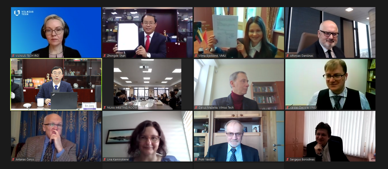 1月12日下午,我校与立陶宛维尔纽斯格迪米纳斯技术大学(Vilnius Gediminas Technical University,简称“Vilnius Tech”)、维陶塔斯·马格纳斯大学(Vytautas Magnus University ,简称“VMU”)两所高校联合召开视频会议,举行了全球战略合作伙伴关系协议、国际合作联合实验室协议的线上签署仪式。校长单忠德,副校长姜斌,Vilnius Tech校长Daniuas Alfonsas,VMU副校长Vilma Bijeikienė出席了会议。会议由姜斌主持。
