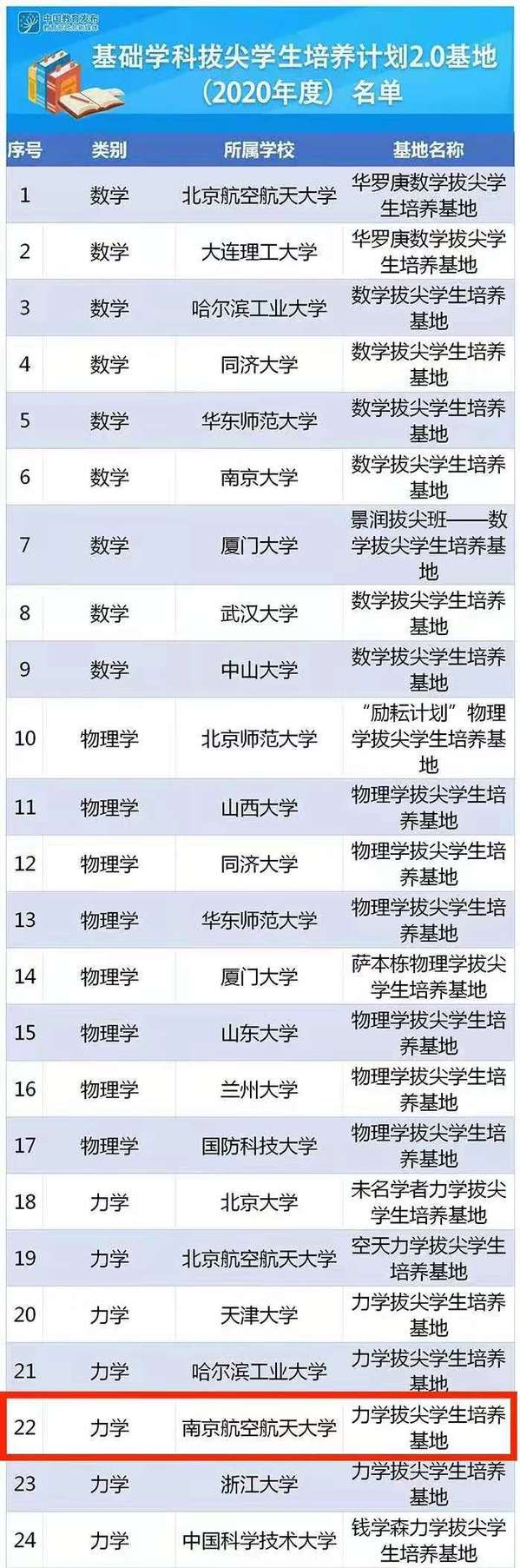 近日,教育部正式公布了基础学科拔尖学生培养计划2.0基地(2020年度)名单,我校力学拔尖学生培养基地成功入选。