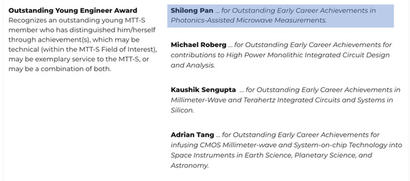 电气与电子工程师协会(Institute of Electrical and Electronics Engineers,IEEE)目前共有会员42万人及39个分会。微波理论与技术协会(MTT-S)成立于1952年,是IEEE第5大协会。现有会员约有10万人,在全世界有190个分会。IEEE MTT-S 杰出青年工程师奖主要用于表彰在微波领域技术和社会服务方面做出杰出贡献的青年学者。评选内容包括论文、专利、学术活动以及对学术界、工业界的贡献等,每年不超过4人获此殊荣。