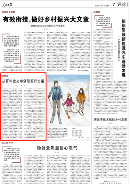 3月1日出版的《人民日报》在第7版刊登了我校马克思主义学院党委书记徐川教授的理论文章《从百年党史中汲取前行力量》,现将全文转发如下: