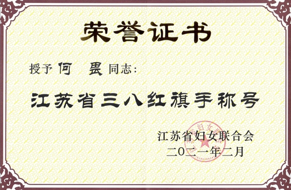 日前,江苏省妇联对2020年度江苏省三八红旗手标兵、三八红旗手、三八红旗集体进行了表彰,我校马克思主义学院副院长何畏教授荣获江苏省“三八红旗手”称号。