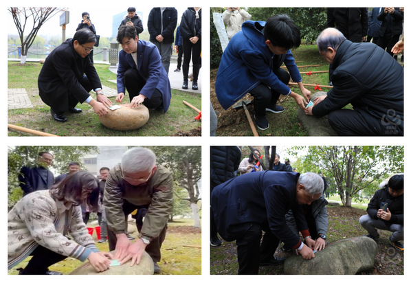 植树前,院士们与领航班班长一起将具有唯一标识的“二维码”贴于“院士林”石头指定位置,成功开启“云端院士林”,在场师生纷纷扫码分享院士们的个人经历、突出贡献、科研故事。