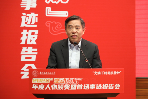 单忠德代表学校对2020“感动南航”年度人物获奖者表示热烈祝贺,对他们在平凡的岗位上创造了不平凡的业绩表示崇高敬意。他表示,此次报告会不仅是对我校师生精神面貌和奋斗风采的生动展示,更是创造性开展党史学习教育,以身边人、身边事诠释学史明理,学史增信,学史崇德,学史力行的重要举措。他希望广大南航师生以年度人物为榜样,从他们高尚追求中汲取奋斗的力量,从他们奋力拼搏中磨砺坚毅品质,从他们无私奉献中升华思想,勇于成为新时代加快世界一流大学建设者、贡献者。
