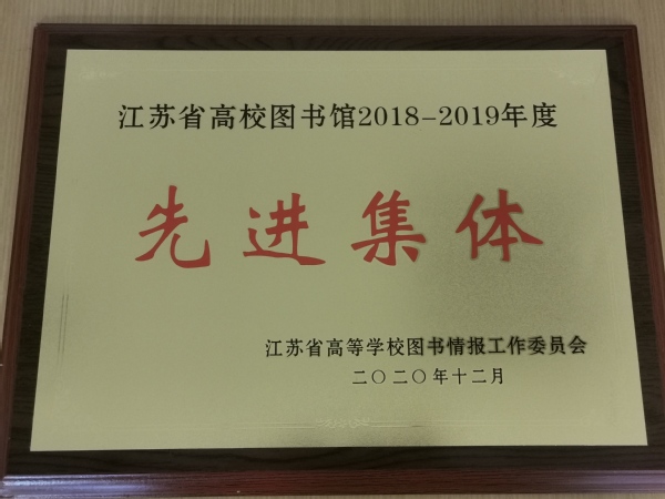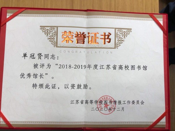 近日,在江苏省高等学校图书情报工作委员会开展的2018—2019年度全省先进集体和优秀馆长的评选活动中,我校图书馆喜获江苏省高校图书馆“2018-2019年度先进集体”荣誉称号,单冠贤同志荣获“2018-2019年度优秀馆长”称号。