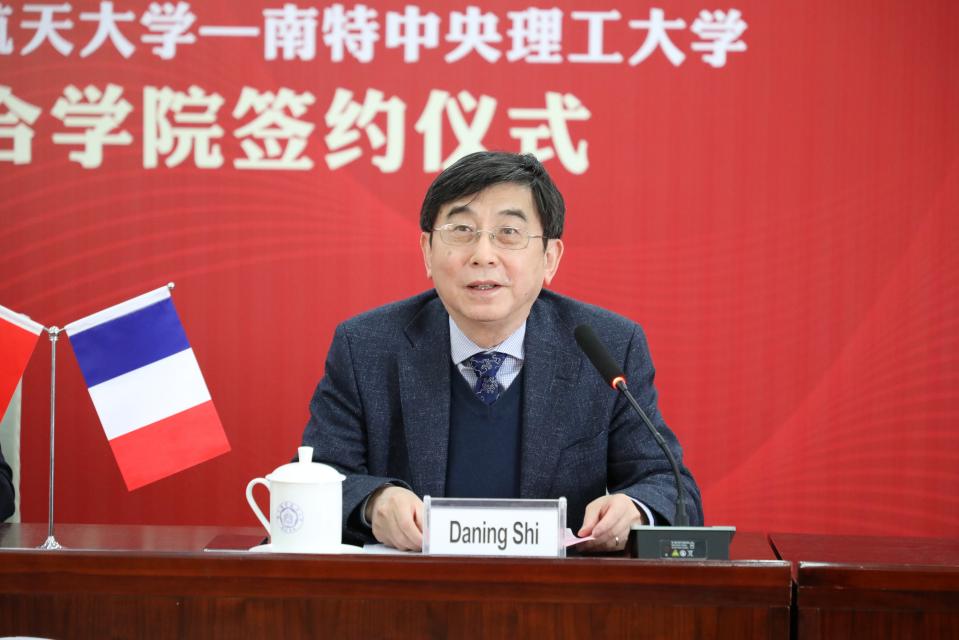施大宁在发言中感谢中法双方对成立南航-南特联合学院所做出的努力。他强调联合学院对于双方都具有积极意义,不仅有利于培养具有国际竞争力的高层次人才,更能助力双方学校的综合发展。最后,他再次感谢中法高校双方的投入,并对两校未来的合作发展寄予厚望。