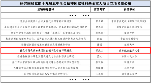 近日,全国哲学社会科学工作办公室正式公布了研究阐释党的十九届五中全会精神国家社科基金重大项目招标立项名单,我校人文与社会科学学院王建文教授领衔申报的《优化市场化法治化国际化便利化营商环境研究》成功中标,获批立项,这是学校最近三年斩获的第4项国家社科基金重大项目。