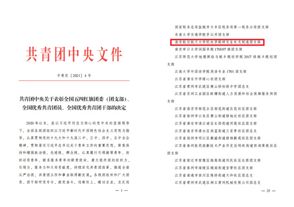 共青团中央发布《共青团中央关于表彰全国五四红旗团委(团支部)、全国优秀共青团员、全国优秀共青团干部的决定》(中青发〔2021〕4号)。我校机电学院研究生电光制造团支部荣获“全国五四红旗团支部”荣誉称号。这是我校2013年度获评此项荣誉后再次获此殊荣,“全国五四红旗团支部”是共青团中央授予基层团支部的最高荣誉,是新形势下全面推进团的基层组织建设、活跃基层团工作的重要载体。