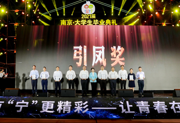此次毕业季活动综合在宁高校留宁就业数据及创新成果贡献,评选出10个2021南京·大学生毕业季“引凤奖”高校。典礼现场,省委常委、市委书记韩立明为我校颁奖。