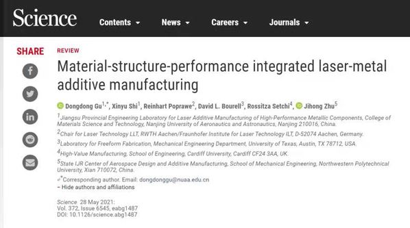 2021年5月28日,国际著名学术期刊《Science》发表了我校材料科学与技术学院、江苏省高性能金属构件激光增材制造工程实验室顾冬冬教授团队的研究综述论文《材料–结构–性能一体化激光金属增材制造》(Dongdong Gu*, Xinyu Shi, Reinhart Poprawe, David L. Bourell, Rossitza Setchi, Jihong Zhu, Material-structure-performance integrated laser-metal additive manufacturing. Science 2021, 372, eabg1487)。标志着我校在基础研究和重大成果方面取得新突破。我校是本文第一署名单位,顾冬冬教授为本文第一作者和通讯作者。