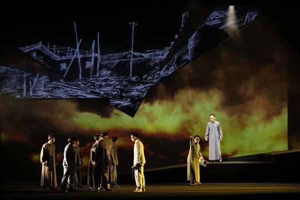 舞台呈现上,首先值得肯定的是舞台美术设计。舞台上的主体背景由一道投影幕和一道黑色景片组成,配合投影幕使用了正投和反投两部投影仪,交待戏剧时间、地点、环境,黑色景片升降使用,以旋翼形状出现,意在扣题,烘托全剧意境。其次必须称赞的是导演二度创作。全剧没有使用大的置景和道具,把舞台充分地展开,为戏剧行动服务。无论独白戏、还是对手戏,还是群戏,都借助于简单的道具,通由多样的舞台调度和成熟的导演技法来完成戏剧行动,使平淡的故事有了紧凑的戏剧节奏,使平淡的人物有了灵动的戏剧呈现。如此一来,当全剧呈现在舞台上时,便可以紧紧地抓住观众。