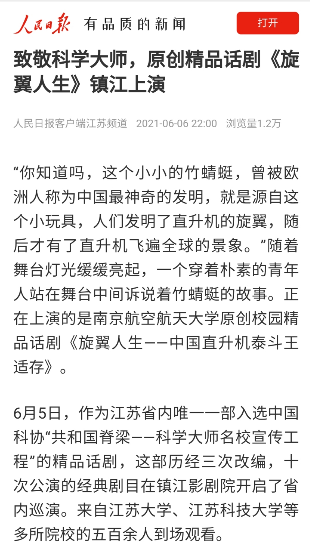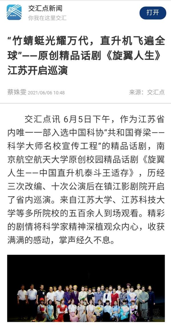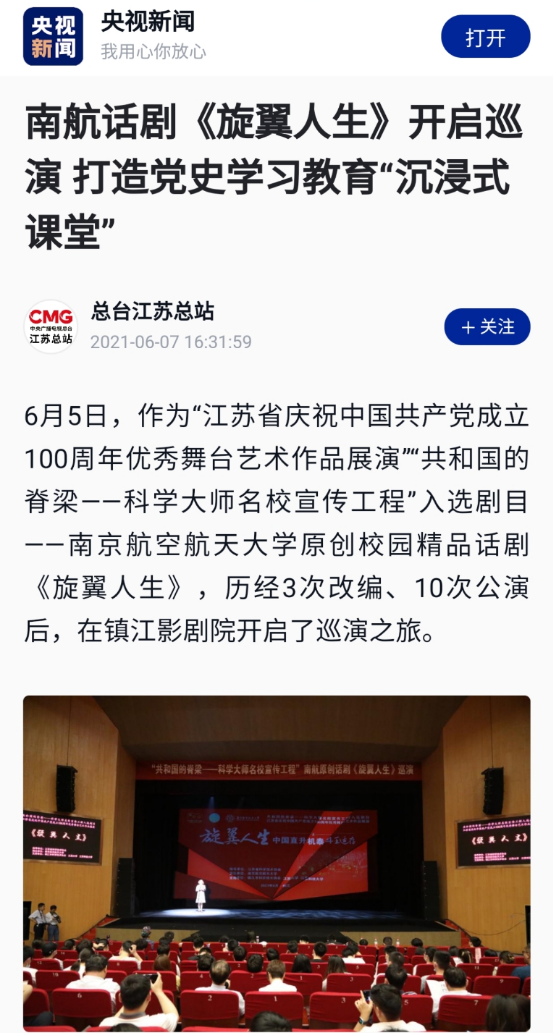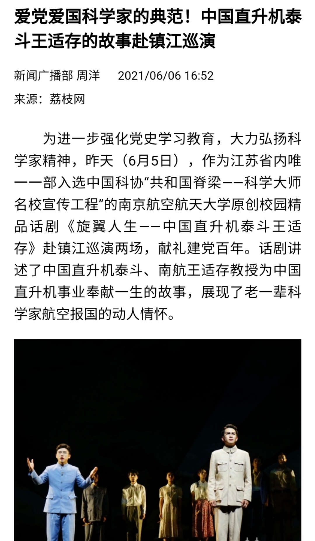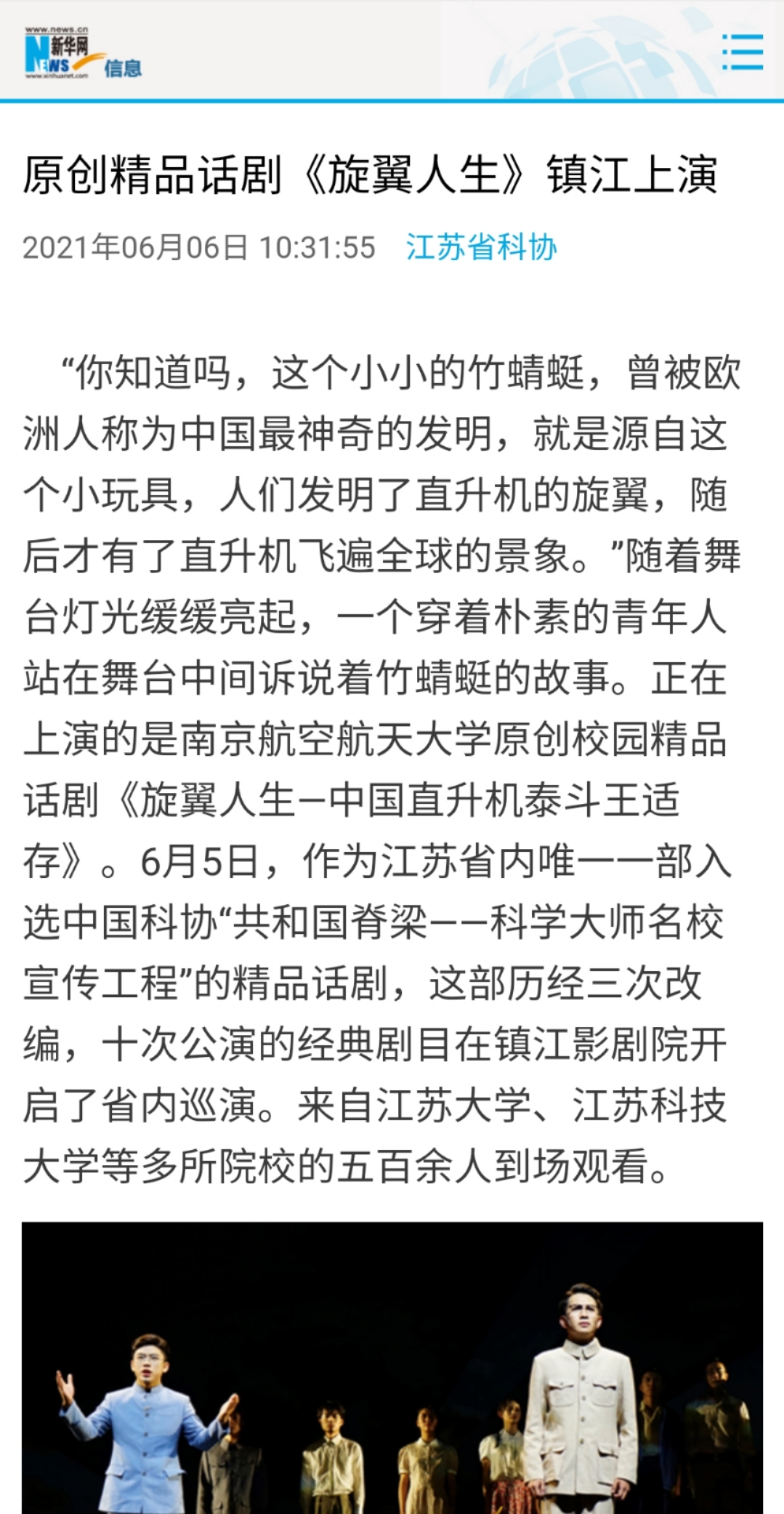 编者按:6月5日,作为“江苏省庆祝中国共产党成立100周年优秀舞台艺术作品展演”“共和国的脊梁——科学大师名校宣传工程”入选剧目——我校原创校园精品话剧《旋翼人生》,于镇江影剧院开启了省内巡演之旅,人民日报、新华网、央视新闻、新华日报等主流媒体纷纷进行报道。现转发相关报道如下: