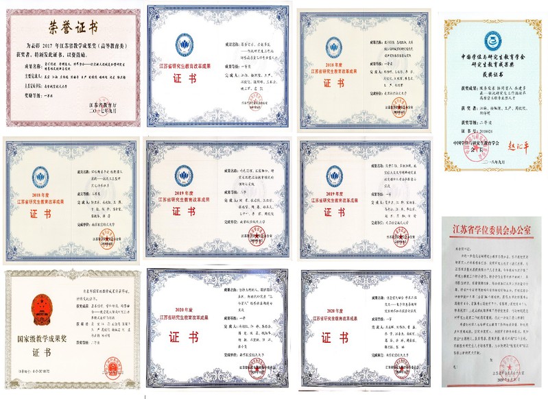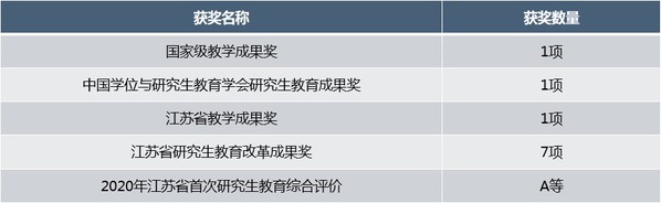 “十三五”期间,我校研究生教育教学成果丰富,先后获国家级教学成果奖1项,中国学位与研究生教育学会成果奖1项,获省级教育教学成果奖/研究生教育改革成果奖8项。2020年,在江苏省首次进行的研究生教育综合评价中,我校获评最高等级。