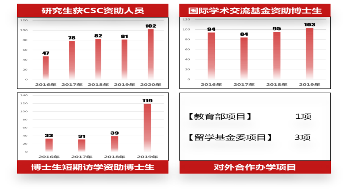 4.加强国际化培养,研究生教育国际化能力不断提升。全面推进研究生国际化教育水平,不断优化专业、深化课程设置改革。“十三五”期间,390名研究生获国家留学基金委资助出国(境)联合培养和攻读博士学位,598名研究生受资助赴国(境)外开展国际学术会议和短期访学,受资助人数分别较“十二五”期间增长169%和85%。连续召开八届研究生国际学术会议,联合中国航空学会举办首届航空学会研究生国际学术会议。获批教育部中外合作办学项目2项(“南航-英国克兰菲尔德大学联合培养双硕士学位项目”、“南航-莫航航空航天类研究生双硕士学位项目”),获批留学基金委创新型人才国际合作培养项目1项、俄-乌-白人才培养专项1项。