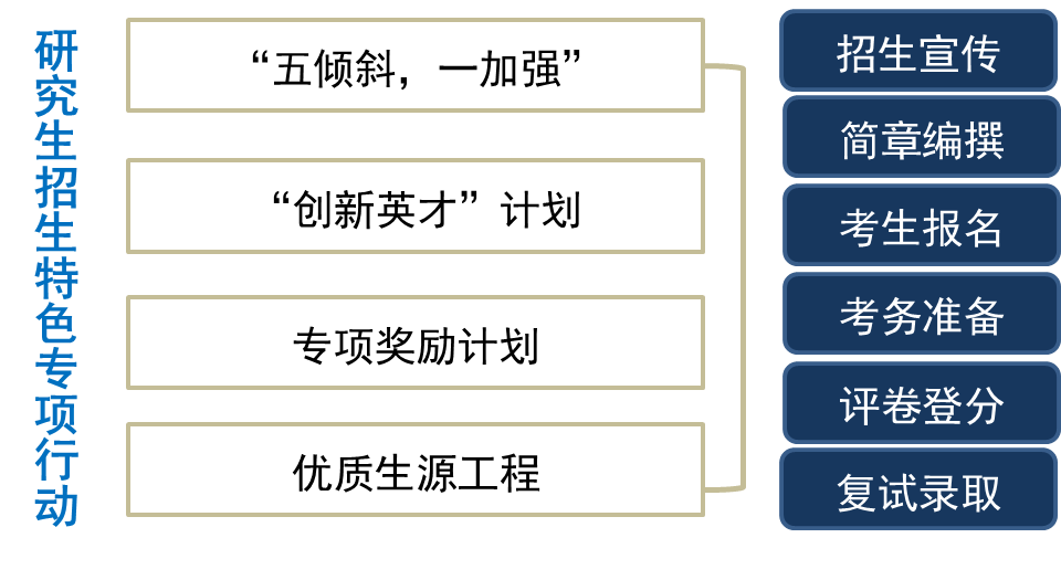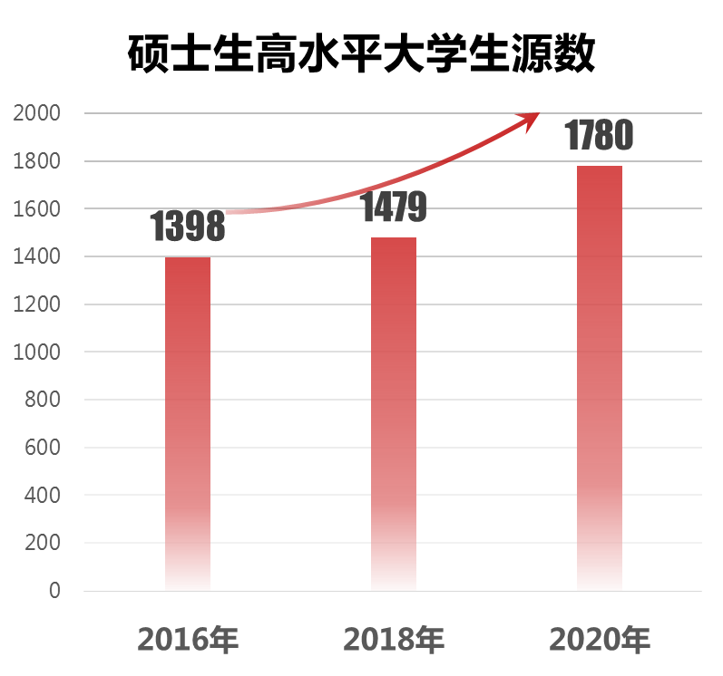 硕士招生通过实施“优质生源工程”“专项奖励计划”“创新英才计划”等,生源质量稳步提升,2020年招收推免生共计841人,较上一年度增长38%;硕士研究生中录取本校生增长26%。持续加大“硕博连读”研究生的选拔,博士研究生招生全面实行“申请-考核”制,“双一流”生源规模较“十二五”末增长43%,博士生中“双一流”生源超过60%。研究生招生指标分配坚持“突出质量、服务需求”的原则,按照“五个倾斜、一个加大”的思路分配指标,即通过向高峰高原学科、新兴交叉学科、重要基础学科等倾斜、向高质量人才培养倾斜、向高水平科研成果倾斜、向高层次人才队伍倾斜、向国家级重大项目、基地、平台等倾斜,加大科研经费招收博士计划支持力度等措施,提升资源配置效率和质量,服务发展大局。
