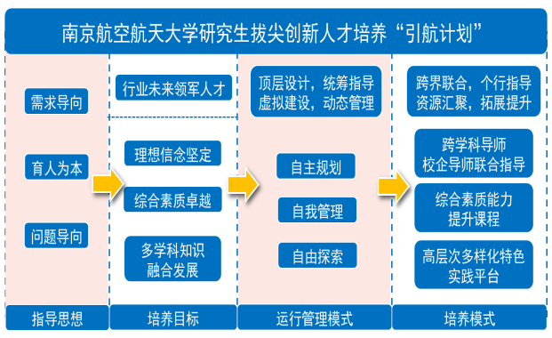 5.实施“引航计划”,纵深推进拔尖创新研究生培养。统筹校内外优势资源,拓展拔尖创新型研究生联合培养平台,深入实施研究生拔尖创新人才培养“引航计划”。完成首批博士生开班、选拔工作以及“引航导师”的选聘工作,实施跨学科、跨行业导师团队联合指导,通过“跨学科创新基金项目”、“素质能力提升课程”与“行业实训项目”等环节,为学生的跨学科、创新性、个性化发展提供广阔空间和更多资源,培养航空航天民航领域未来领军人才。