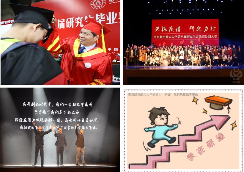 打造“共抗疫情·研途力行”“缤纷研途·用心护航”“跃动研途·青春启航”,以及“研途思政漫画”等品牌活动,构建常态化思政教育机制,用国防军工文化、行业红色文化和校本德育资源滋养学生,切实落实立德树人根本任务。其中以研究生音乐情景剧大赛为代表的校园文化活动深受学生欢迎,共举办8届,累积近千名研究生参与演出,优秀剧目《南航·三张·岁月》获教育部、中国科协“科学大师名校宣传工程”资助项目。持续推出10期手绘漫画形式的系列研究生思政教育漫画,部分推送受到《人民日报》等主流媒体转载。