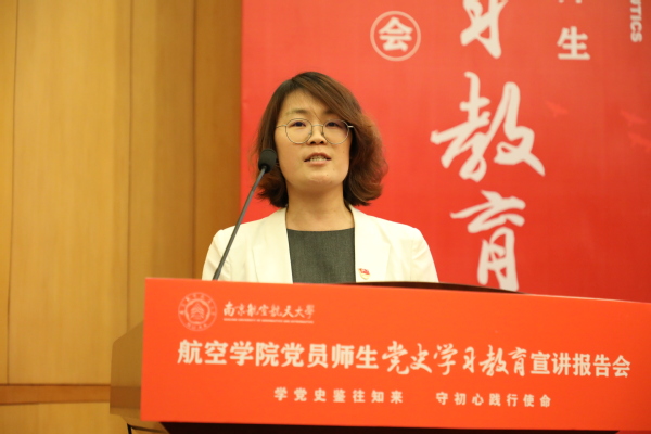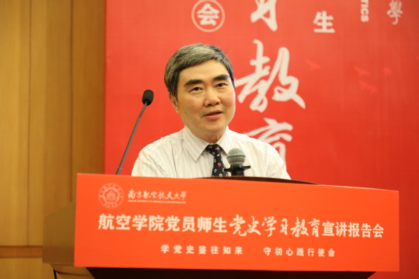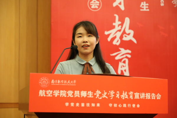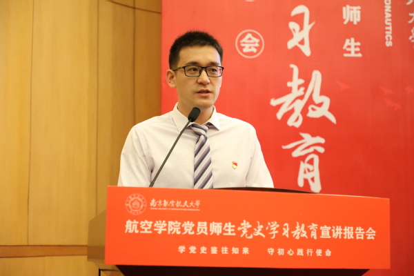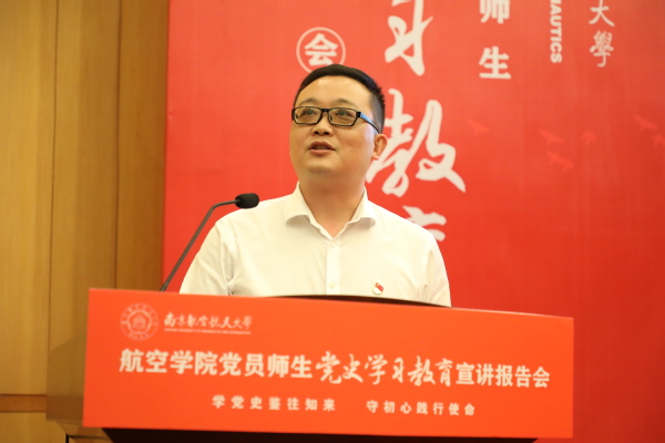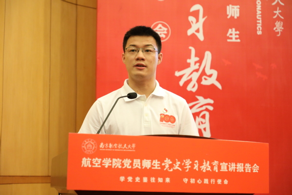 6月10日下午,“学党史鉴往知来 守初心践行使命”航空学院党员师生党史学习教育宣讲报告会(以下简称宣讲报告会)在明故宫校区逸夫科学馆报告厅举行。校党委副书记陶勇,校党委常委、宣传部/教师工作部部长王晖,校党委研究生工作部部长、研究生院副院长张启钱,校党委学生工作处(部)处长侍旭,校团委书记王静出席报告会。航空学院师生党员、发展对象及入党积极分子代表共200余人到场聆听报告会,报告会由学院青年教师、新发展党员陈肇麟和2019级硕士研究生李奕霖主持。