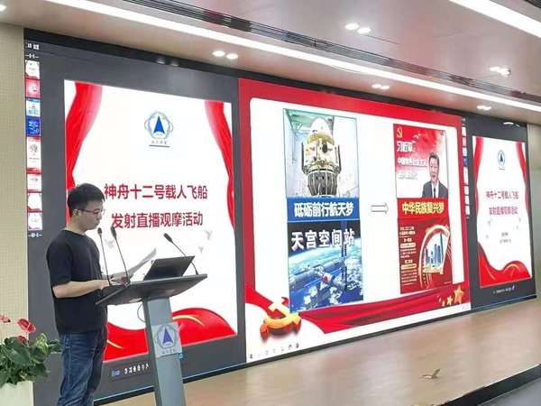 在神舟十二号载人飞船出征太空央视直播特别节目中,正在我校航空航天馆观看直播的飞行器设计与工程专业、核技术专业学生、导航制导与控制专业与央视演播室嘉宾进行了交流互动。