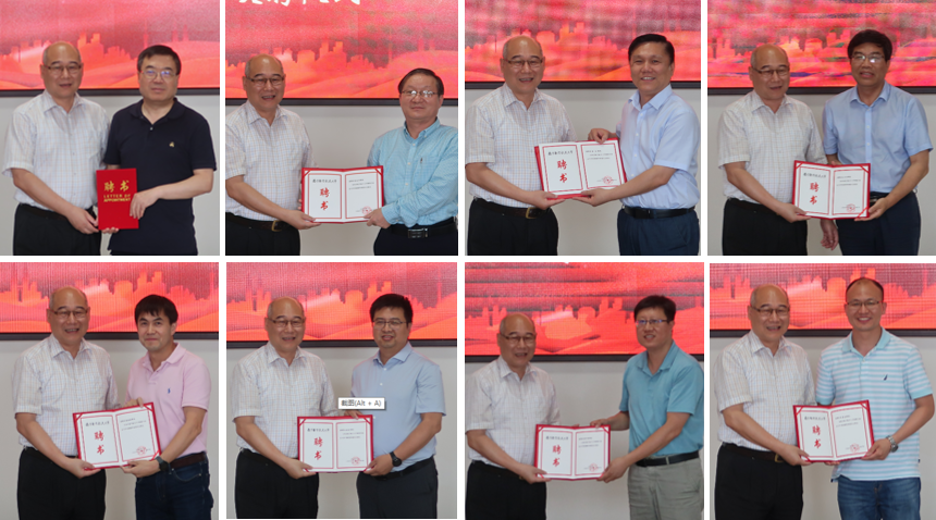 授聘仪式现场,黄志球依次为西安电子科技大学马建峰教授、中国科学院大学李凤华教授、中国科学技术大学熊焰教授、上海交通大学谷大武教授、清华大学段海新教授、北京理工大学祝烈煌教授、西北工业大学韩军伟教授、湘潭大学李哲涛教授等网络空间安全领域的专家委员颁发聘书。