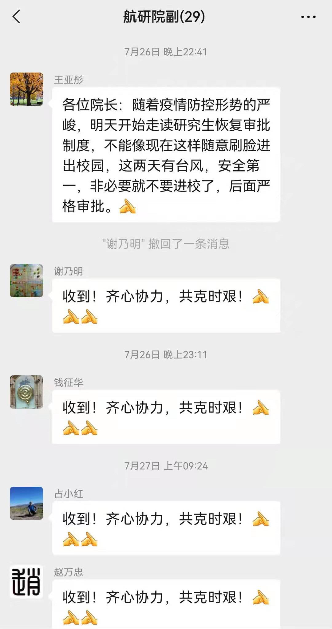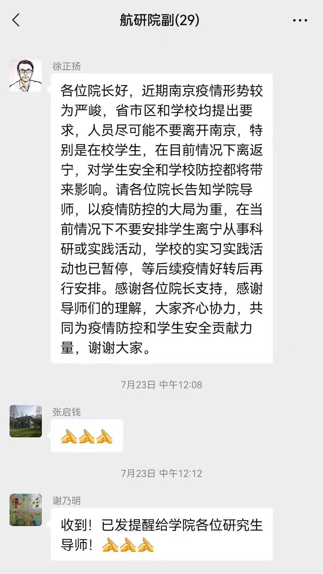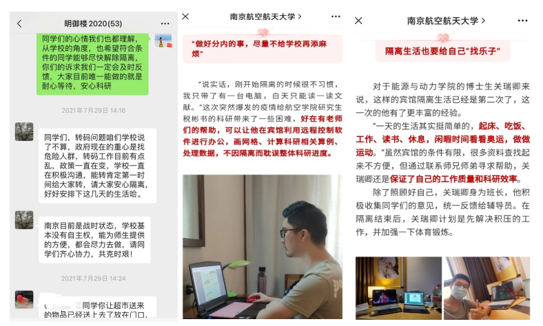 抓细抓实、精准施策。面对河南灾情,组织研究生辅导员梳理河南籍研究生受灾情影响情况,为55名受灾研究生发放补贴;落实集中隔离研究生心理动态监测,点对点做好关心关爱、心理疏导和安全稳定工作;精准梳理i南航打卡数据,对异常数据逐项落实排查。