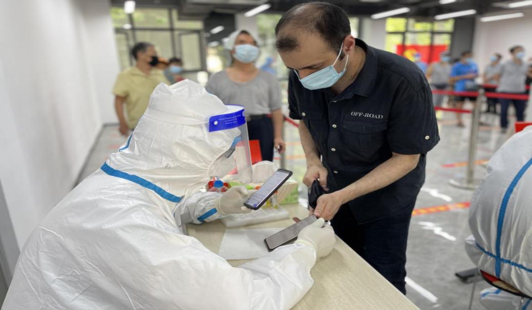 徐乾整理留学生疫情防控数据 唐崟捷与留学生在核酸检测现场
