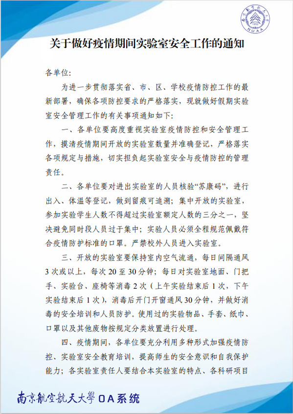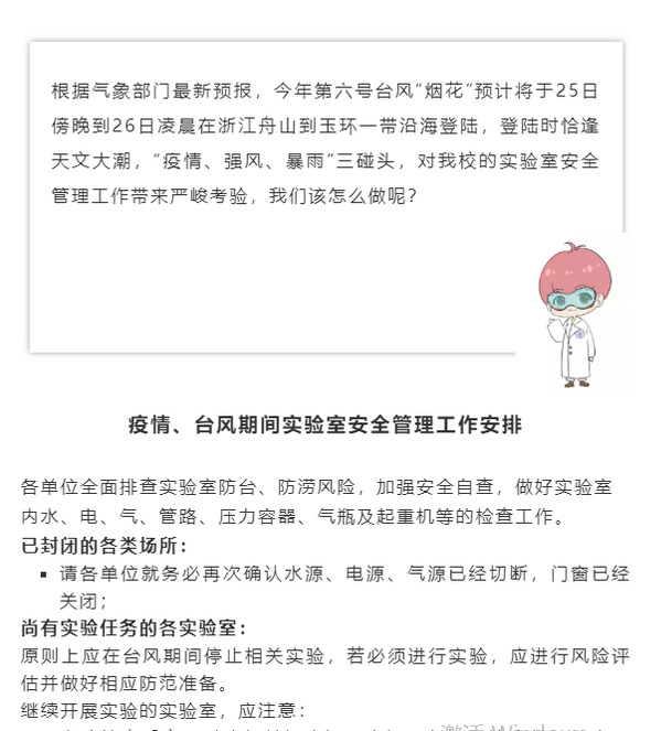 加强实验室落实各项疫情防控工作要求,发布《关于做好疫情期间实验室安全工作的通知》、《疫情、台风期间实验室安全管理工作安排》,向校内住宿的青年教工发布严格规范公寓管理的通知。