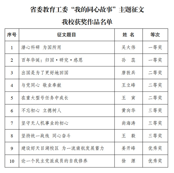 “我的同心故事”主题征文是全省高校统一战线庆祝中国共产党成立100周年的重要活动之一。校党委统战部积极组织广大统一战线成员认真学习贯彻习近平总书记“七一”重要讲话精神,各院级党组织、民主党派基层组织精心选送主题征文。我校统一战线成员以亲历者、见证者的视角,全面讲述了我校统一战线成员与党同向同行的深切感悟、留学归国报国的心路历程,以及矢志奋斗的航空报国故事,充分展现了学校统一战线积极向上的精神面貌。
