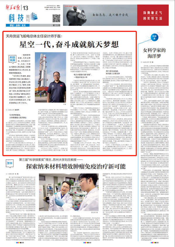 9月22日的《新华日报》科技周刊报道我校2000级校友、天舟货运飞船电总体主任设计师于磊的科研事迹,现转发全文: