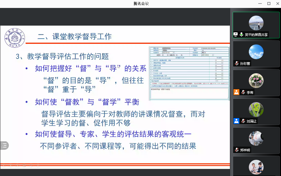 校督导组吴瑾教授、航空学院督导组组长昂海松教授、理学院督导组组长吴平教授分别就新时期教学督导工作理念与思路、毕业设计(论文)督导工作、加强督导工作保障教学质量的措施等方面进行了专题分享。吴瑾指出,“检查、评价与诊断”是我们督导工作的强项,“指导”工作还需要加强,尤其是工程教育认证背景下教学目标达成的督导还需要进一步强化。昂海松指出本科毕业设计(论文)督导要着眼于开题、中期检查、答辩等三个环节,一方面要善于发现和推荐优秀毕设(论文),另一方面要加强问题论文的督导,问题论文须经督导(组长)审阅同意后方能提交答辩。吴平以试卷检查为例,分享了理学院在基本规范上的做法和措施,还分享了三个如何,即:如何把握好“督”与“导”的关系、如何使“督教”与“督学”平衡、如何使督导、专家、学生的评估结果客观统一。