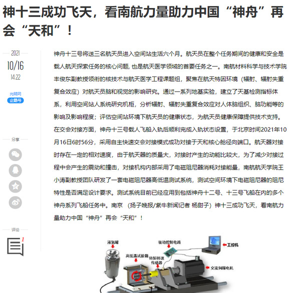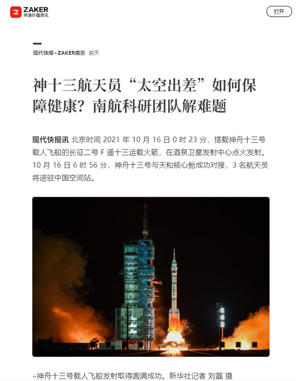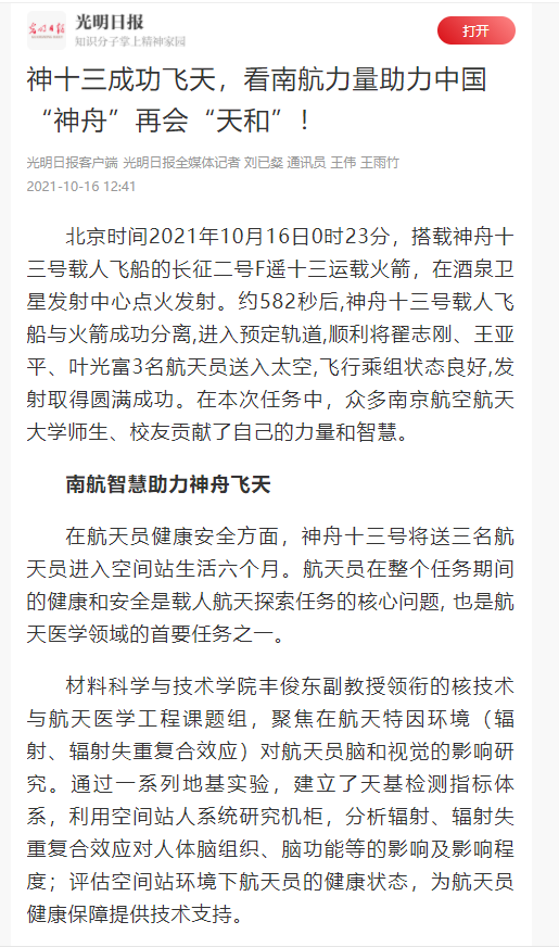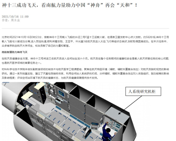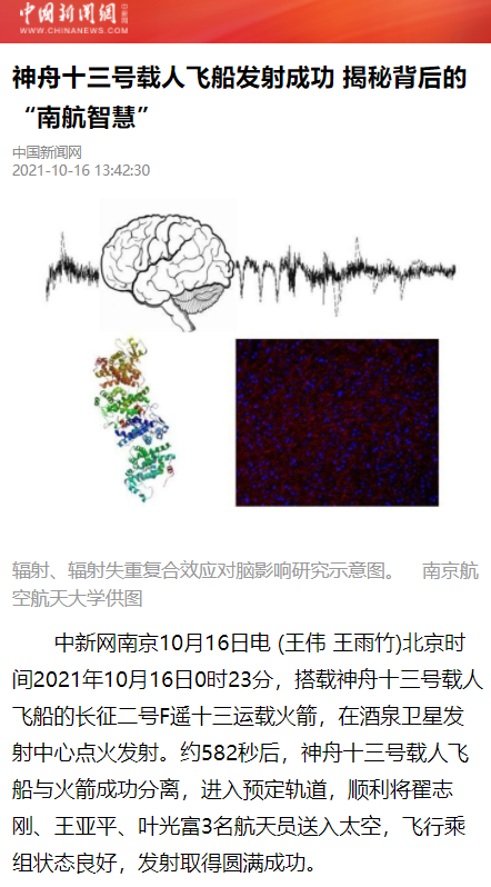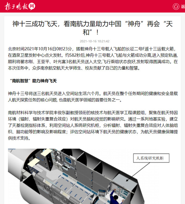 中国新闻网:神舟十三号载人飞船发射成功 揭秘背后的“南航智慧”